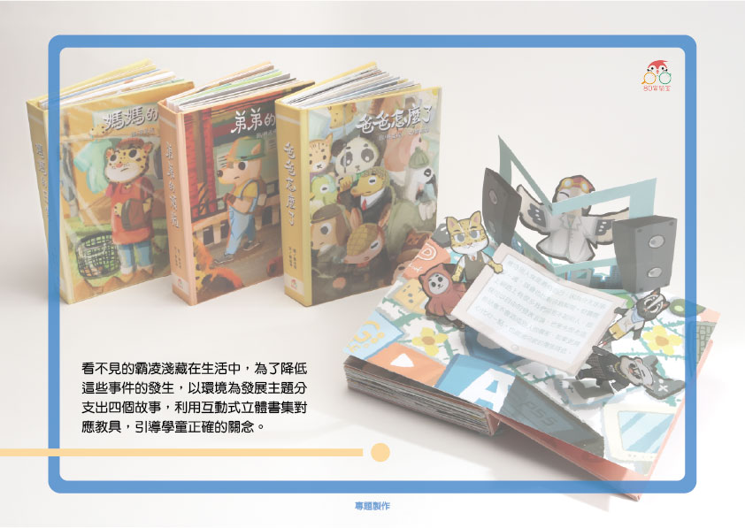 以霸凌為主軸,找尋生活中的四個環境家庭、學校、 職場和網路,利用立體書來吸引小朋友閱讀,讓小朋友了解霸凌的含意,另外也延伸製作教具包,結合立體書故事,家長與小孩一同體驗,讓小孩更了解霸凌的意涵。